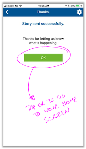 - Tap Send to put your story in PeopleSafe. Your story is sent once you see the Thanks , Story Sent Successfully screen.