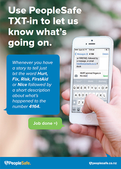 To use PeopleSafe TXT-in you need to make sure you have your mobile number listed in your personal profile. Whenever you have a story to tell just TXT the word Hurt, Fix, Risk, FirstAid or Nice followed by a short description about what's happened to the number 4164. Your message will turn into a PeopleSafe task for your manager or coordinator to follow up. The format of messages into TXT-in is <Keyword> <Space> <Message>. So a message would be something like: "HURT Cut hand on...."