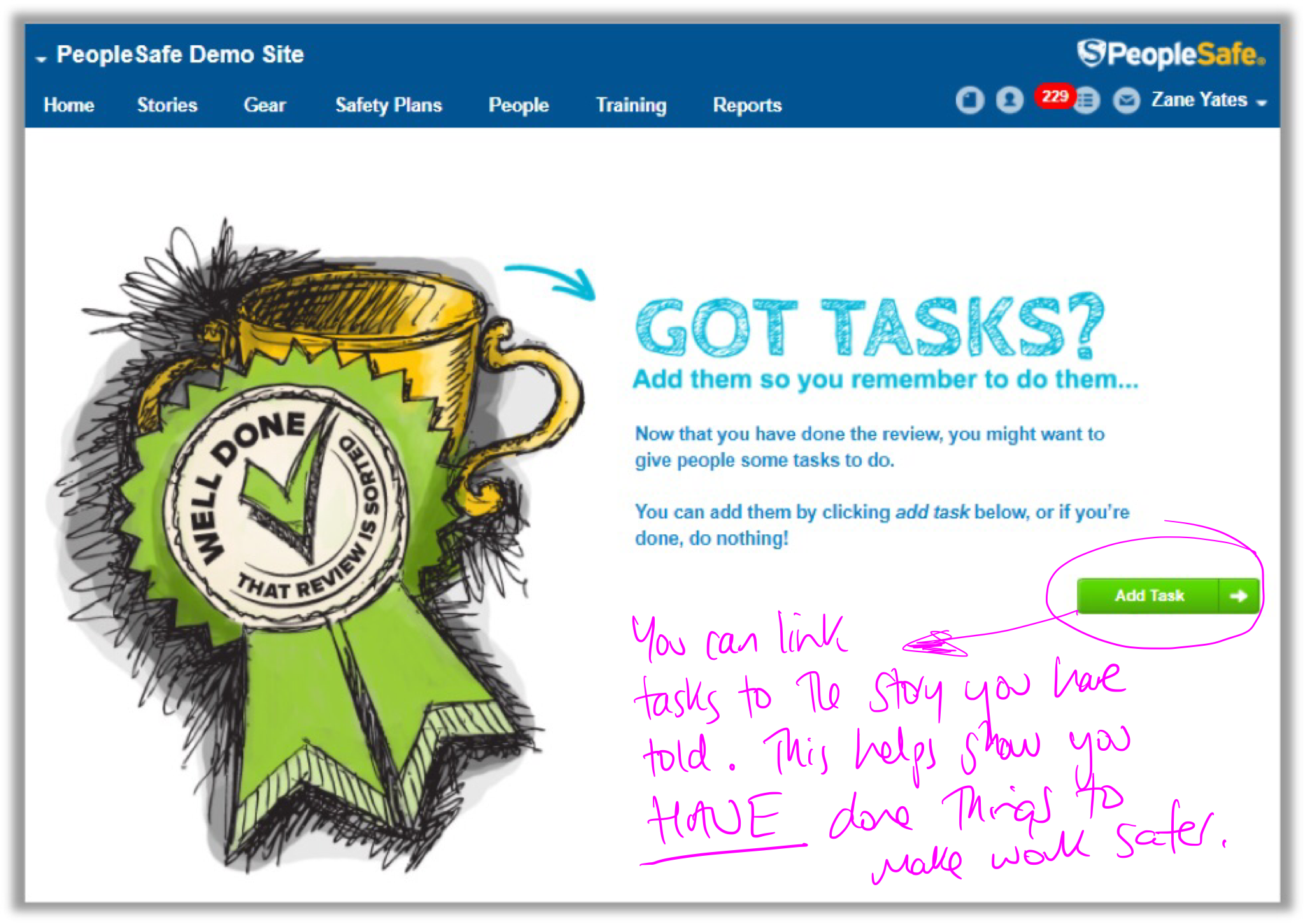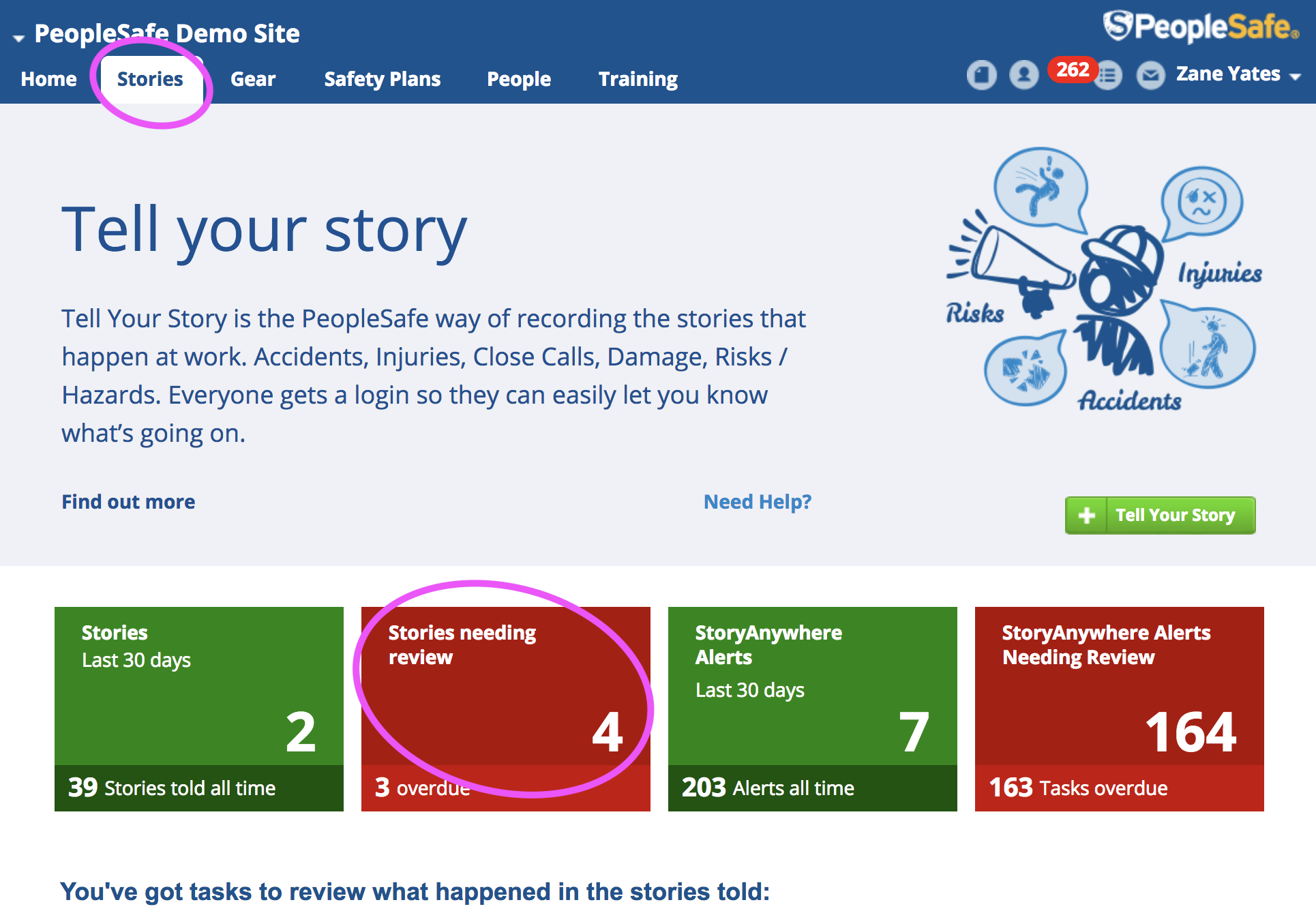 If you've been sent an email about a Story Review Task, or simply want to see all your Story Review Tasks, you can find your tasks, edit or complete them in PeopleSafe using your web browser.