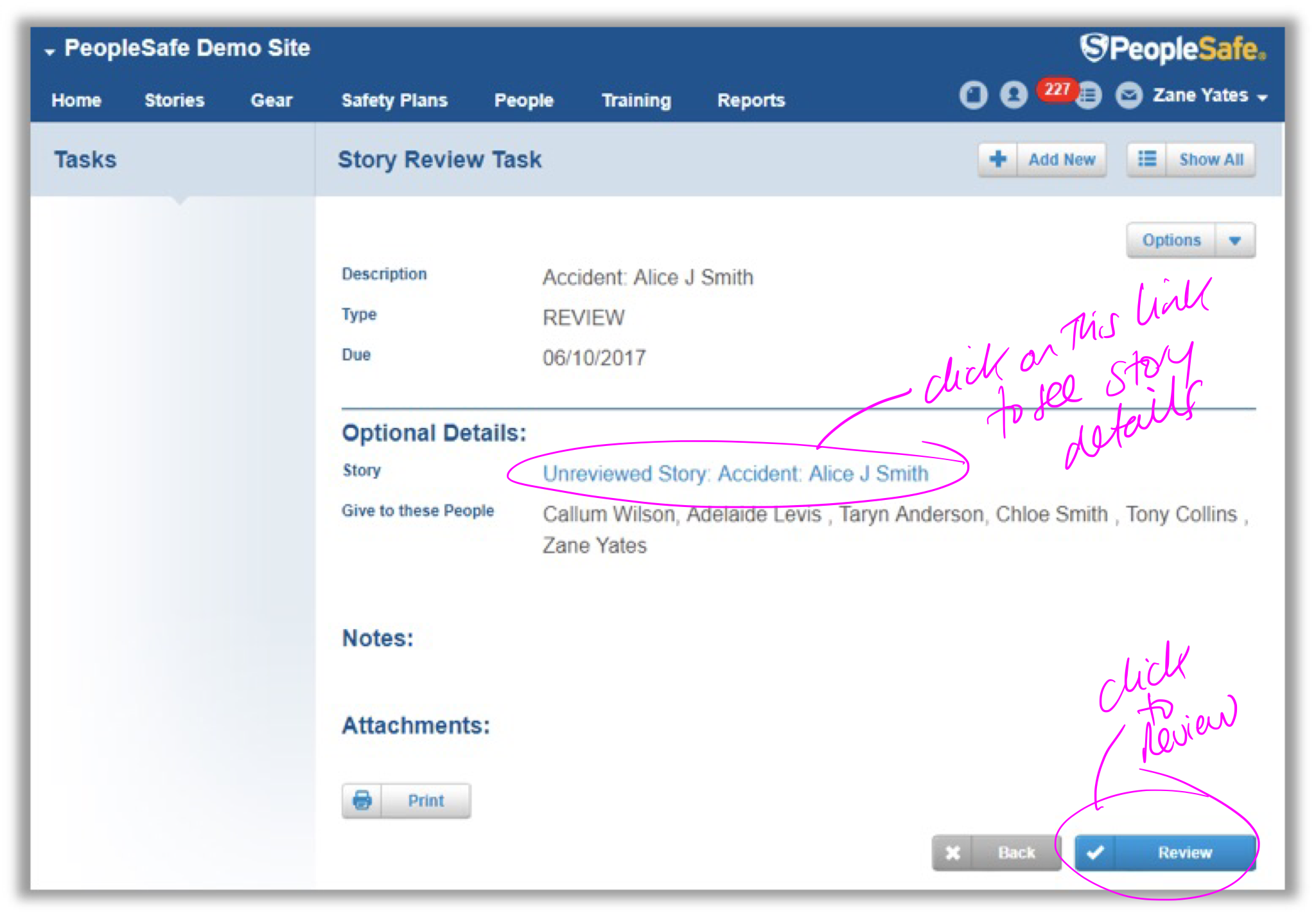 - Check with your Manager or PeopleSafe Coordinator that they have given you access to the Story Review Task. (Your name needs to be selected under: Give to these People).