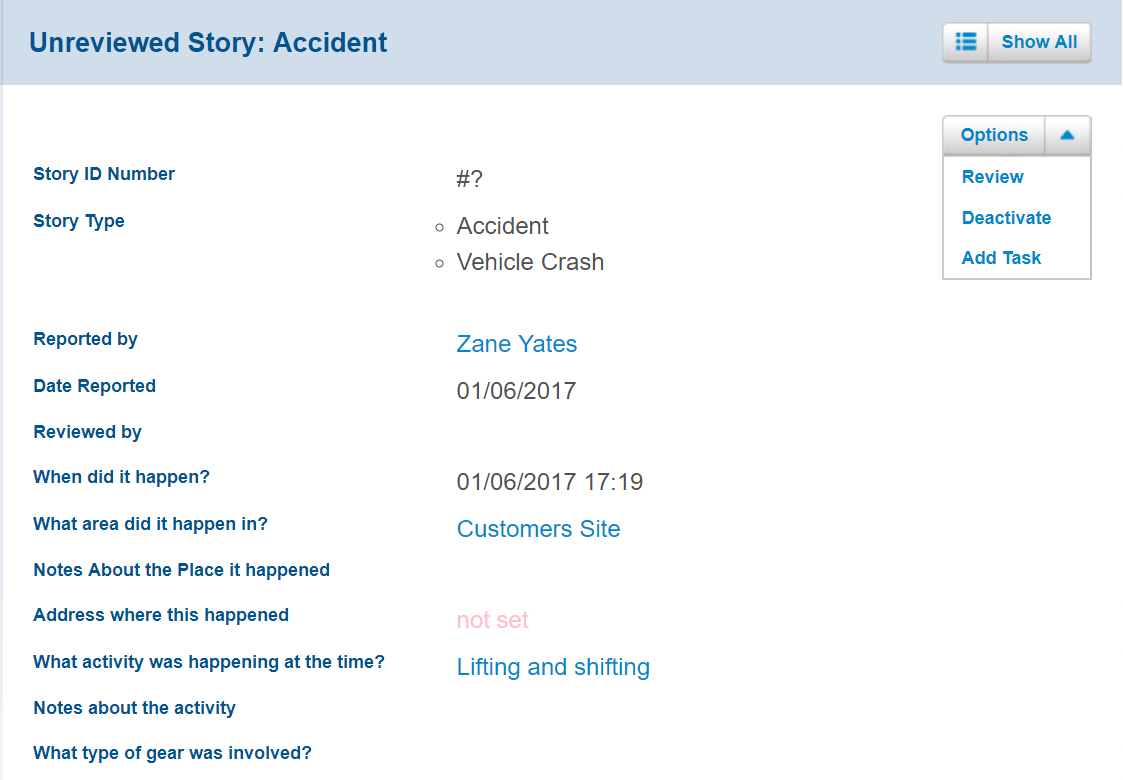 Note: The original story record is unchanged by a review. A review creates a new record that includes any extra details. You'll be able to see any attachments that were added to the original story at the completion of the review. If you have successfully completed the Review, the Story list should show a number assigned to it (rather than "New") and the Review link will disappear, and the now-reviewed Story will also contain a link back to the original.